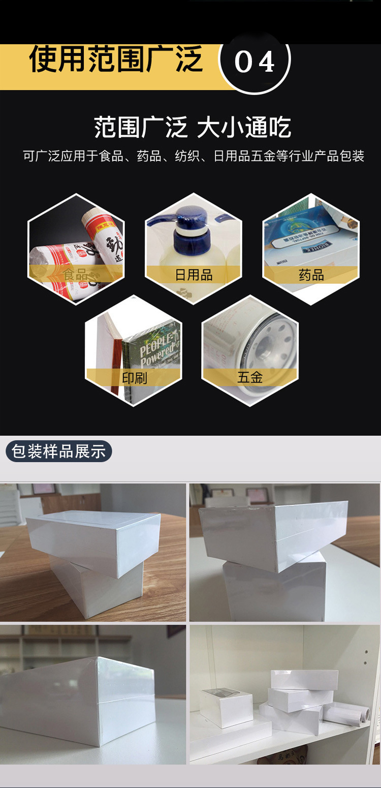 - 適用范圍廣:可以用于包裝各種產品,如食品、飲料、日用品、文具、五金工具等。無論是規則形狀的產品,如長方體的盒子,還是不規則形狀的產品,如玩具、工藝品等,都可以通過調整機器參數進行有效包裝。