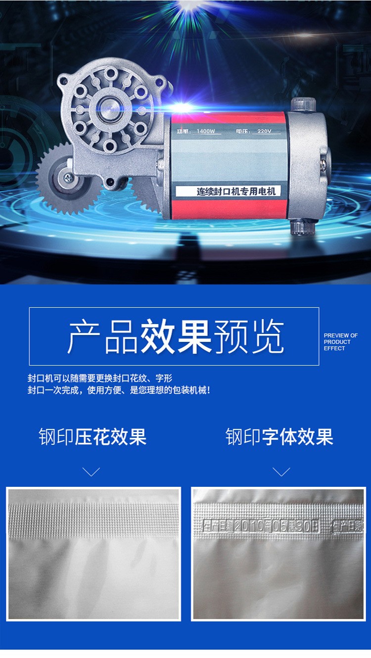 - 封口質(zhì)量穩(wěn)定:由于可以精確控制封口溫度、壓力和速度等參數(shù),連續(xù)式封口機(jī)能夠確保封口質(zhì)量的一致性和穩(wěn)定性。封口牢固、平整,密封性良好,能夠有效防止包裝內(nèi)容物泄漏、受潮或受到污染。在醫(yī)藥和化工等對(duì)包裝質(zhì)量要求較高的行業(yè),這種穩(wěn)定的封口質(zhì)量尤為重要。