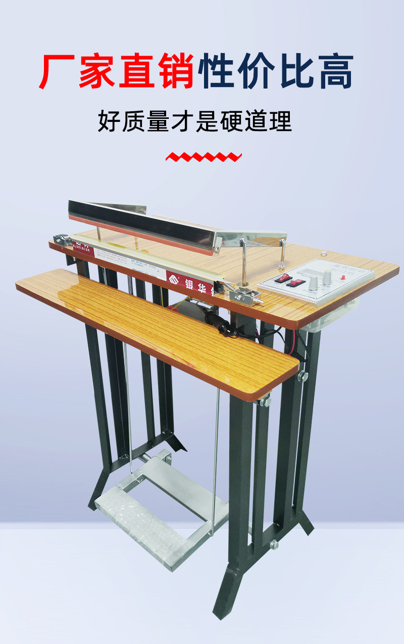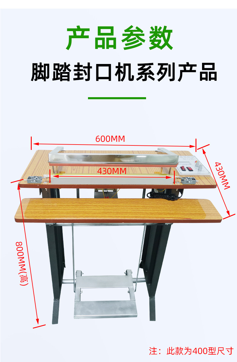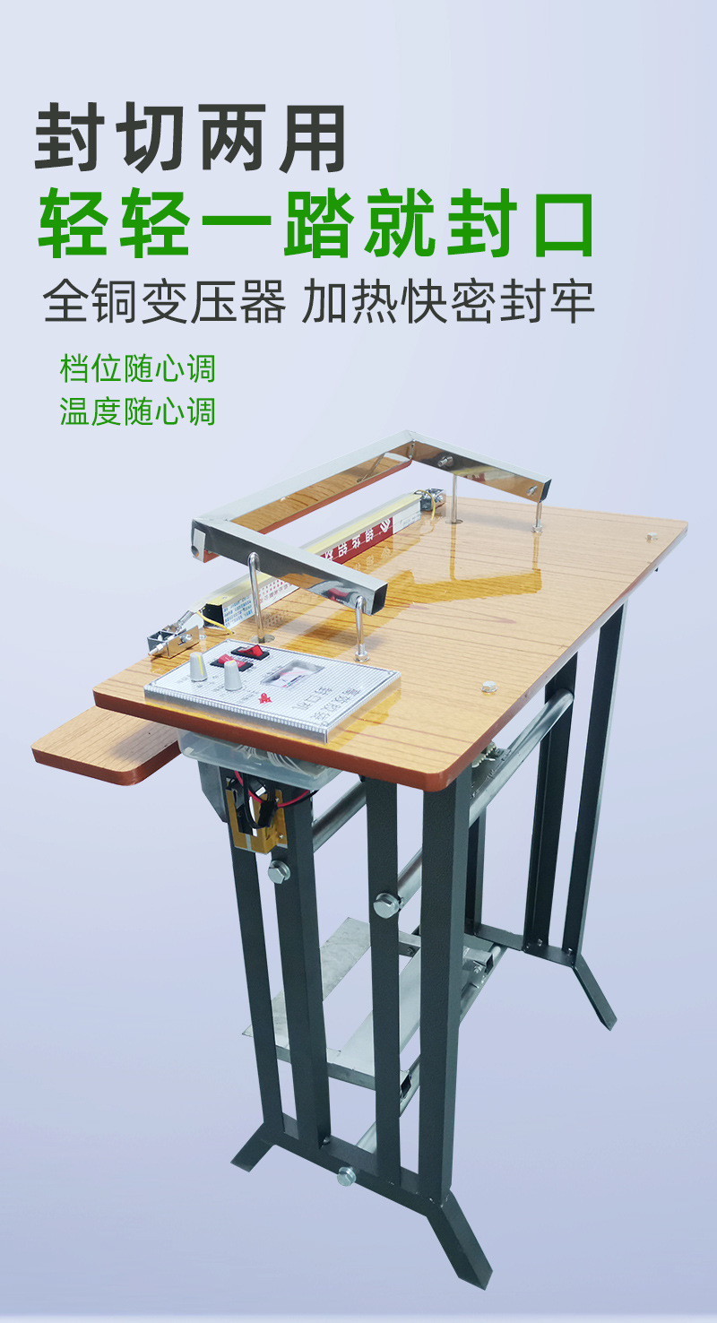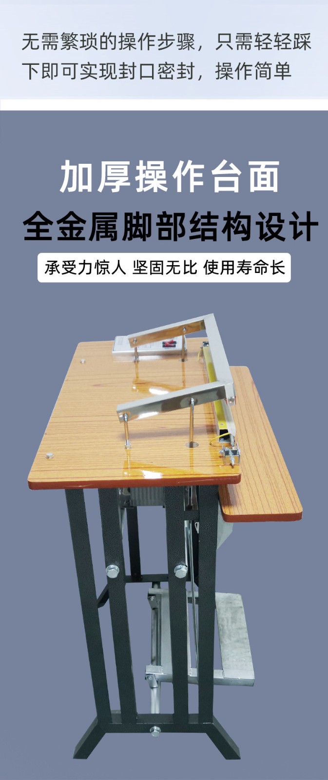 - 操作簡單方便:通過腳踏方式控制封口動(dòng)作,操作直觀、容易掌握。不需要復(fù)雜的電氣控制知識(shí),操作人員可以快速上手。這種簡單的操作方式尤其適合小型企業(yè)、商鋪或家庭作坊等對(duì)包裝設(shè)備操作要求不高的場所。