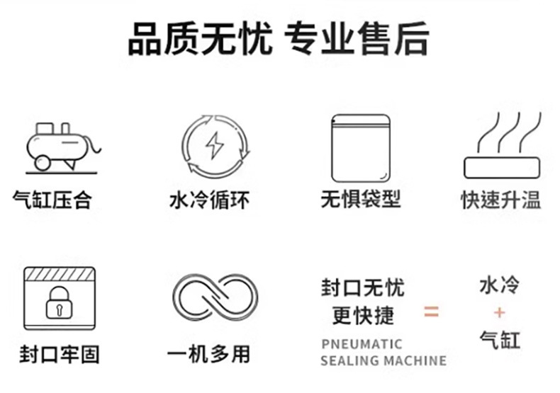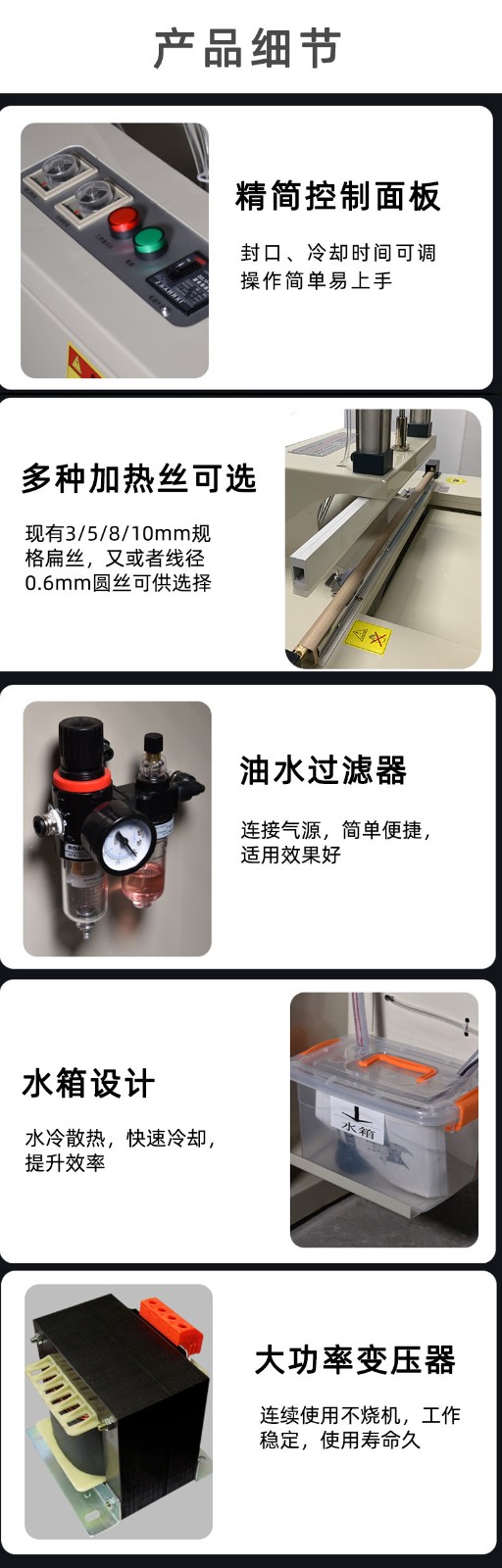 - 連續(xù)工作性強:水冷卻系統(tǒng)能持續(xù)帶走熱量,相較于風冷等方式,設(shè)備不會因長時間工作導致溫度過高影響封口效果,適合高強度、長時間的生產(chǎn)作業(yè)。