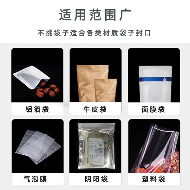 - 適用范圍廣:能夠應(yīng)對不同材質(zhì)、厚度的包裝袋,從輕質(zhì)柔軟的聚乙烯袋到厚實多層的復(fù)合袋,均可完成優(yōu)質(zhì)封口。