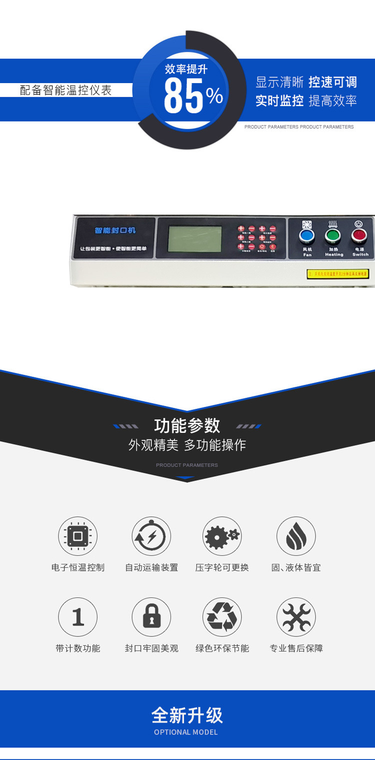 - 封口速度:通常在 5 - 30m/min 之間調(diào)節(jié),快速的封口速度直接提升生產(chǎn)線的包裝效率,企業(yè)依據(jù)產(chǎn)量規(guī)劃靈活設(shè)定。
