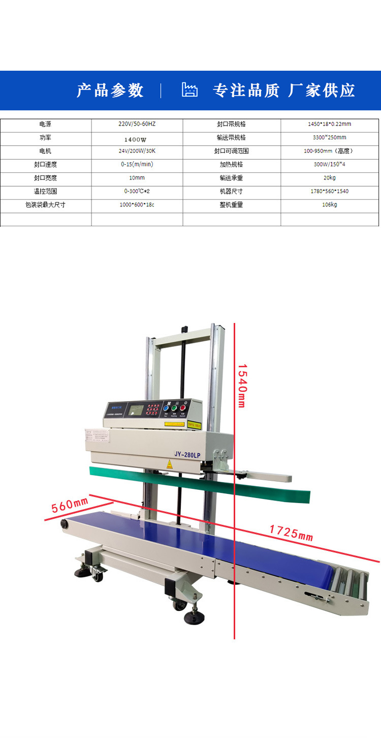 大型連續(xù)式封口機是工業(yè)包裝領(lǐng)域的 “主力軍”,憑借其高效、穩(wěn)定的特性,為大規(guī)模生產(chǎn)提供有力支持,以下是詳細(xì)介紹: