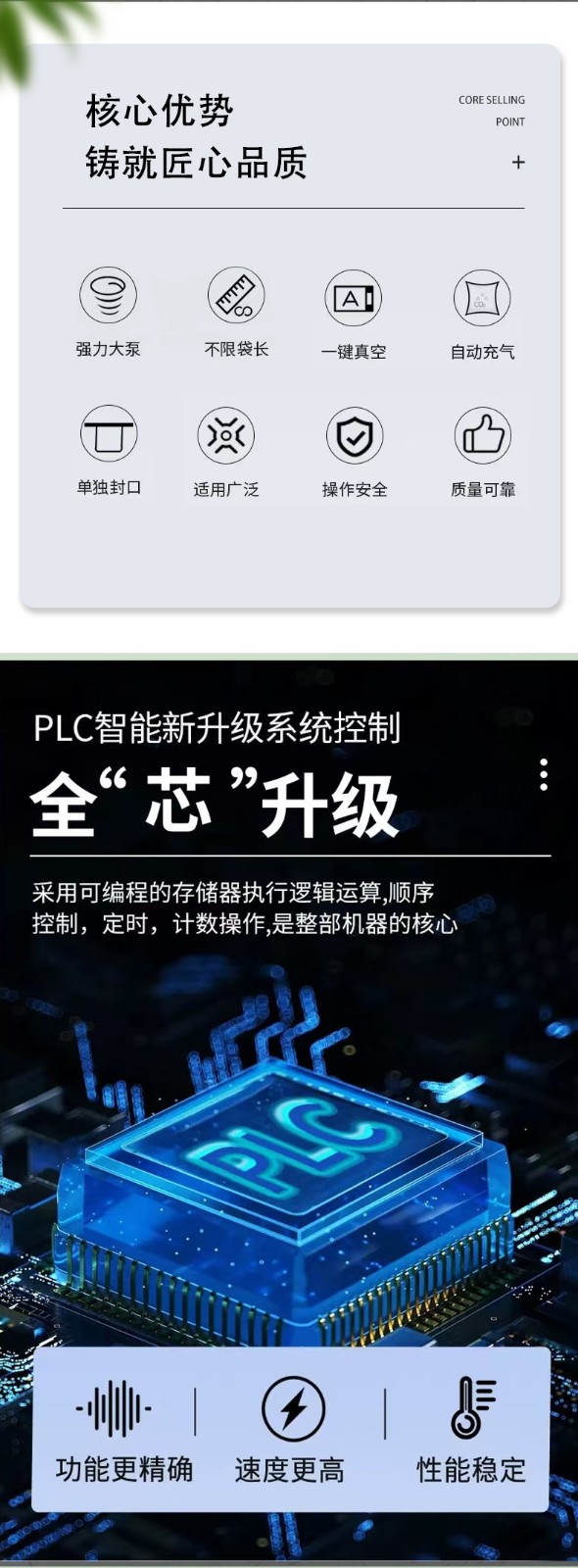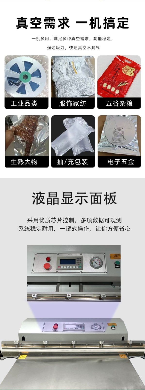 • 外抽式:無需頻繁開關真空室門,包裝袋放置和取出方便,包裝速度快,每分鐘可完成 3 - 5 次包裝循環。